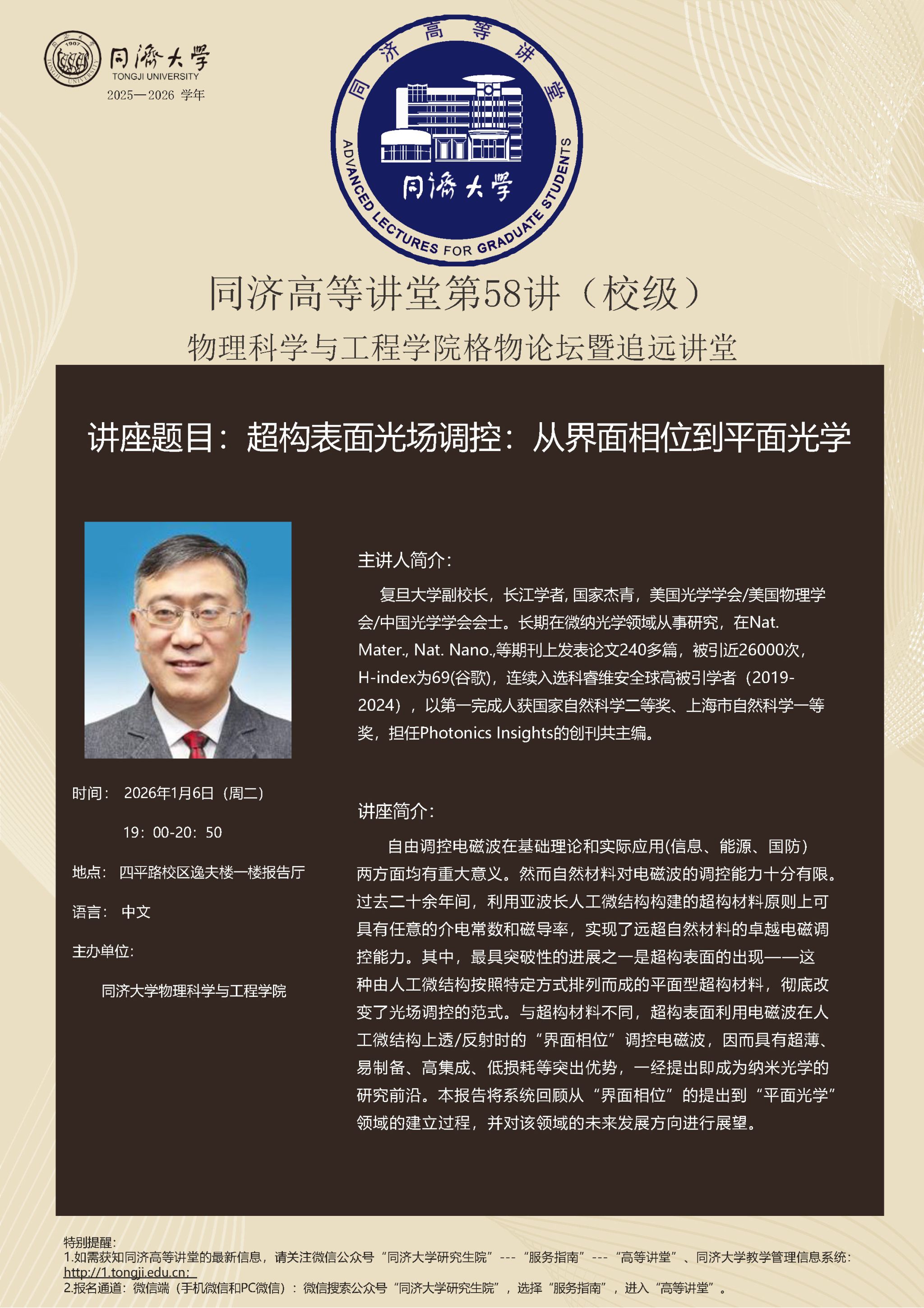 【同济高等讲堂】— 超构表面光场调控:从界面相位到平面光学